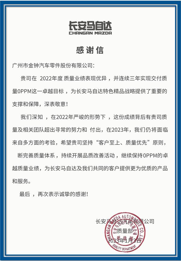 在過去的2022年,我司質(zhì)量及業(yè)績獲得長安馬自達認可,連續(xù)三年實現(xiàn)交付質(zhì)量0 PPM這一卓越目標,為長安馬自達特色精品戰(zhàn)略提供了重要的支撐和保障。接下來,我司會繼續(xù)把好質(zhì)量關(guān),持續(xù)開展品質(zhì)改善活動,繼續(xù)保持0 PPM質(zhì)量業(yè)績,交出讓客戶滿意、讓市場滿意的答卷。